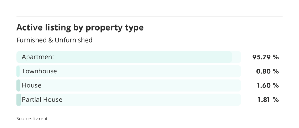 As of April 2026, the most common rental property type was apartments, dominating the majority of all listings in the GTA at 95.79%. Partial houses were the second most common unit type this month, representing 1.81% of active listings, followed by houses at 1.60% and townhouses at 0.80%.