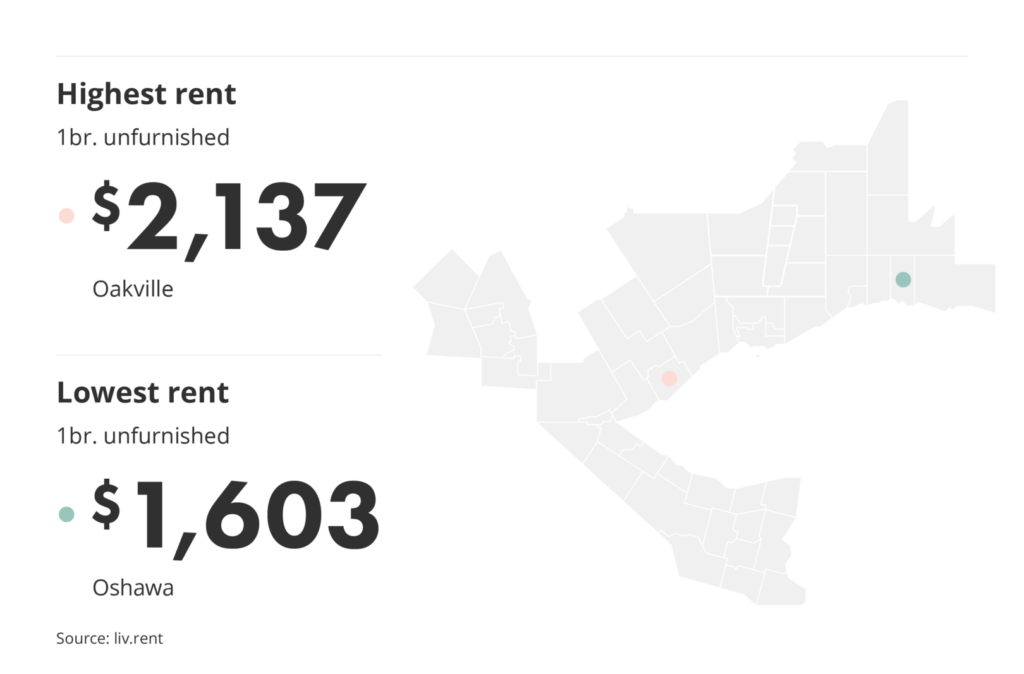 The average rent price for an unfurnished one-bedroom unit in Oakville currently stands at $2,137/month, while in Oshawa the same type of unit rents for an average of $1,603/month – a difference of $514 between the two.