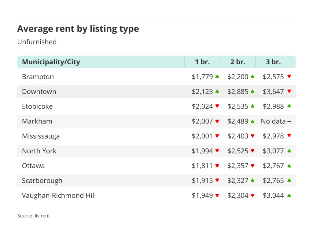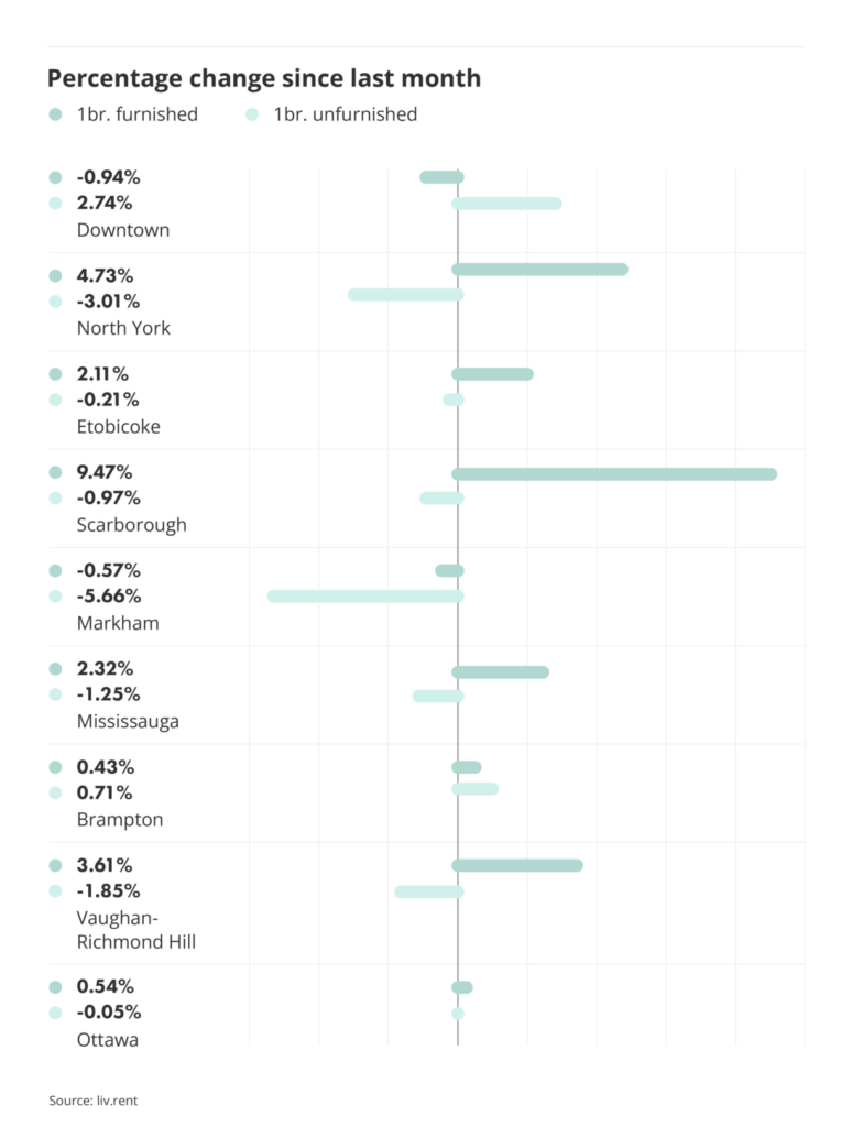 For unfurnished one-bedroom units, Markham (-5.66%), North York (-3.01%), and Mississauga (-1.85%) saw the largest decreases. Meanwhile, Downtown (2.74%) and Brampton (0.71%) saw minor increases.