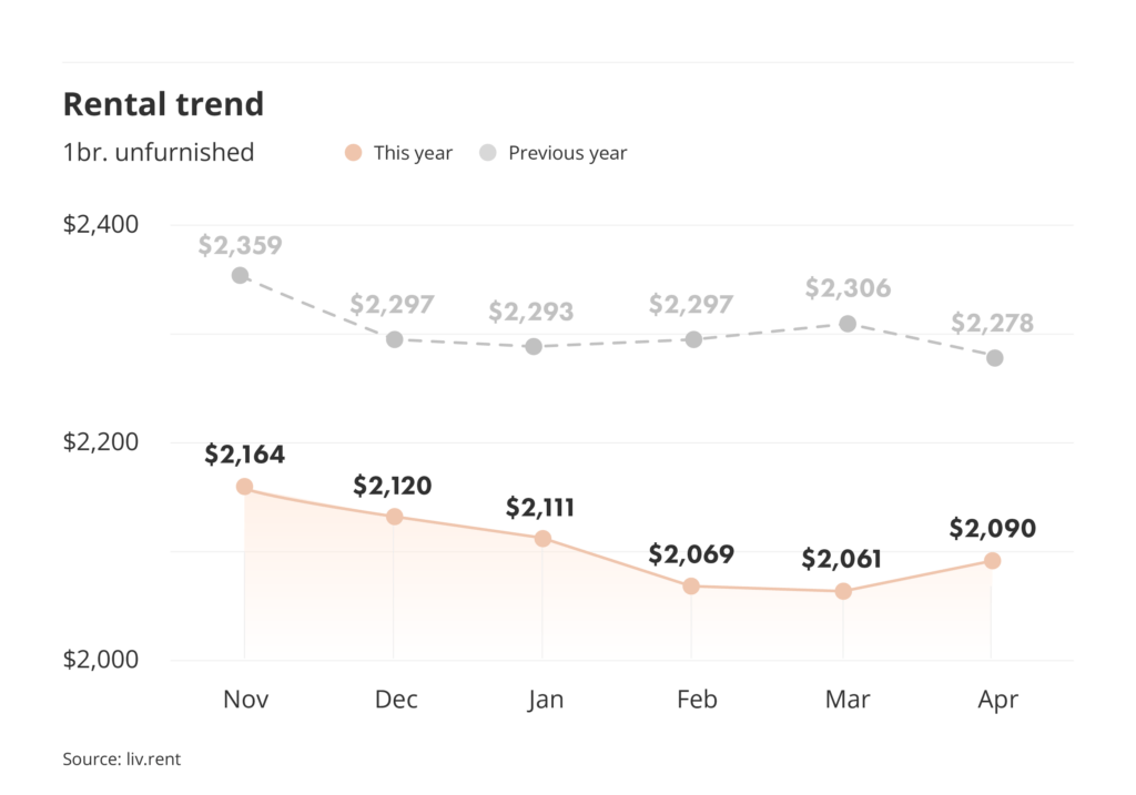 Compared to last month, the average rent price for an unfurnished one-bedroom unit in Toronto decreased by $22 this April to $1,950/month. The average rent for a furnished one-bedroom increased by $26 since last month, bringing the rate to $1,983/month.