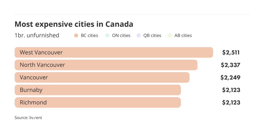 This April, all of the country’s most expensive cities are located in Metro Vancouver. West Vancouver is the most expensive city in the country to rent in, followed by North Vancouver, Vancouver, Burnaby and Richmond.