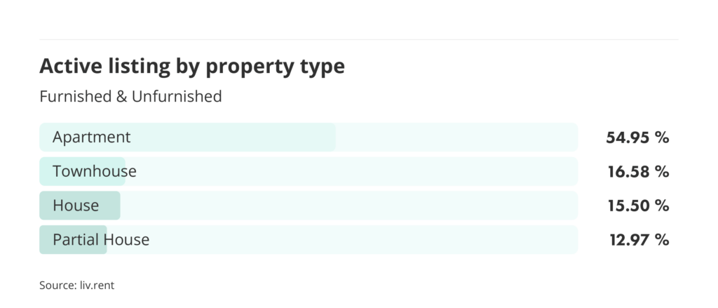 As of December 2025, the most common rental property type was apartments, representing the majority of all listings in the GTA at 54.95%. Townhouses were the second most common unit type this month, representing 16.58% of active listings, followed by houses at 15.50%.