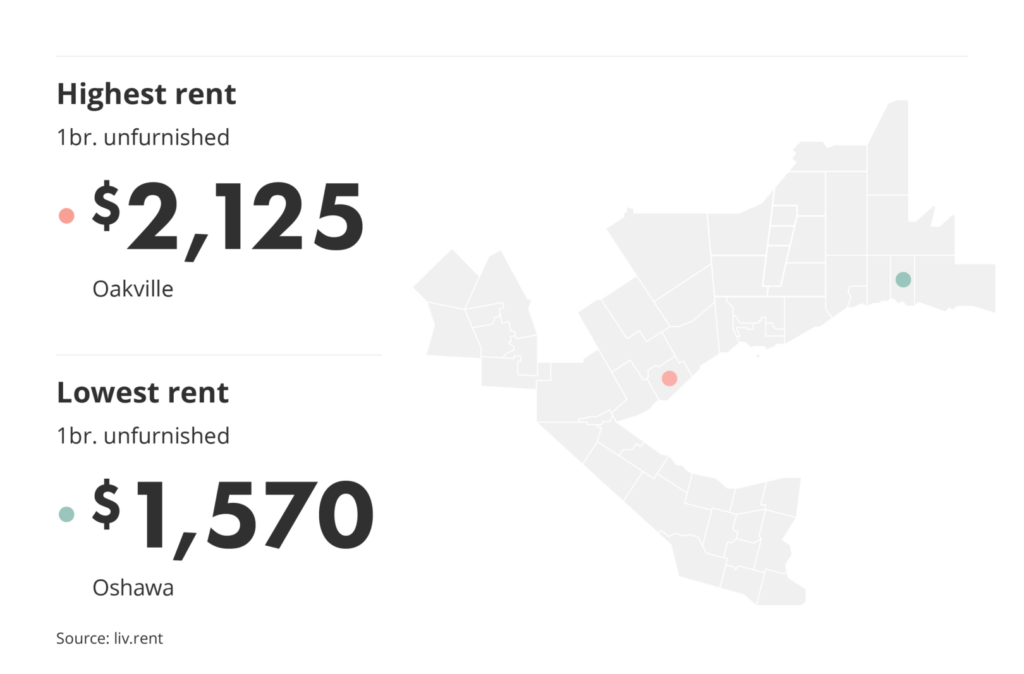 The average rent price for an unfurnished one-bedroom unit in Oakville currently stands at $2,125/month, while in Oshawa the same type of unit rents for an average of $1,570/month – a difference of $555 between the two.