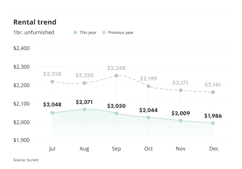 This December, prices for unfurnished one-bedroom units saw a decrease (-1.11%) to $1,986/month while furnished units saw a decrease (-5.99%) to $2,000/month. The average furnished one-bedroom unit rents for $14 more than a one-bedroom unfurnished unit.