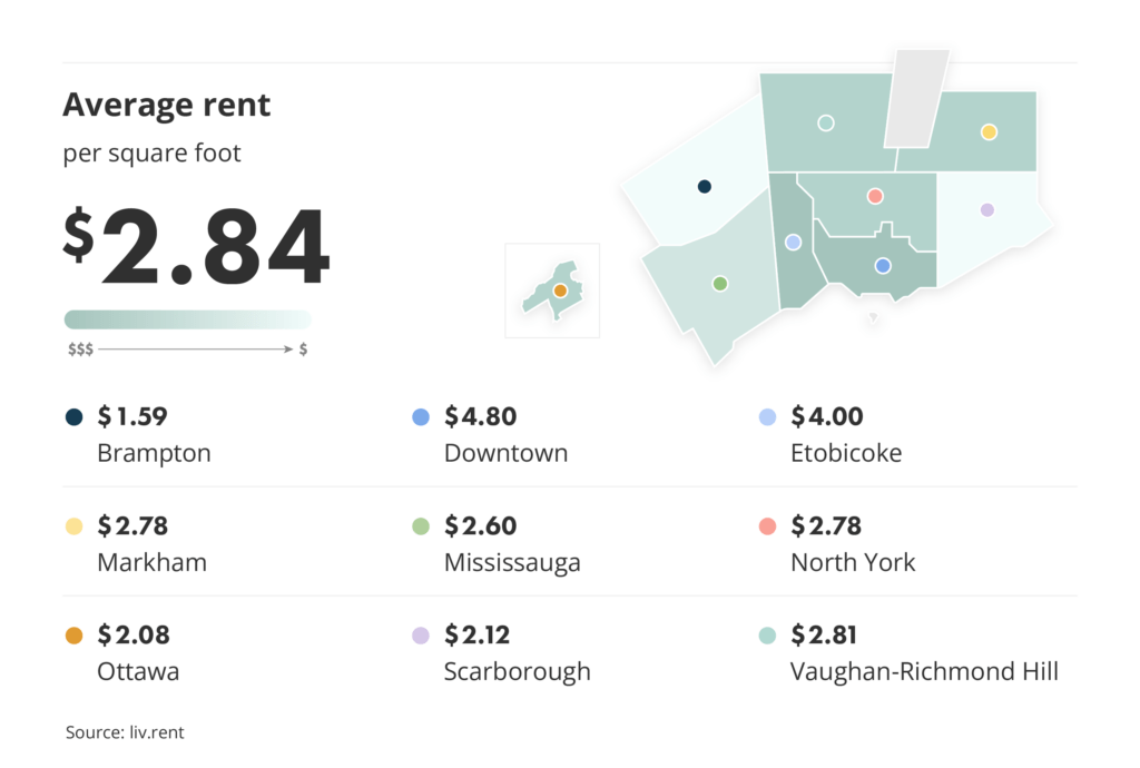 Our monthly Rent Reports also look more closely at the average rent per square foot in cities throughout the Greater Toronto Area. This December, Downtown ($4.80/sq. ft.) had the highest rent per square foot, followed by Etobicoke ($4.00/sq. ft.). At the other end of the spectrum, Brampton has the lowest rent per square foot ($1.59/sq. ft.).