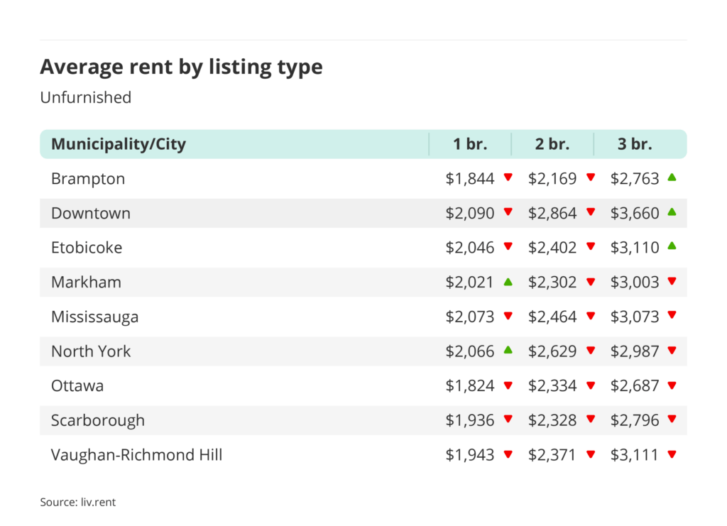 - All unfurnished three-bedroom units decreased in rental price across neighbourhoods except for Brampton, Downtown, and Etobicoke.