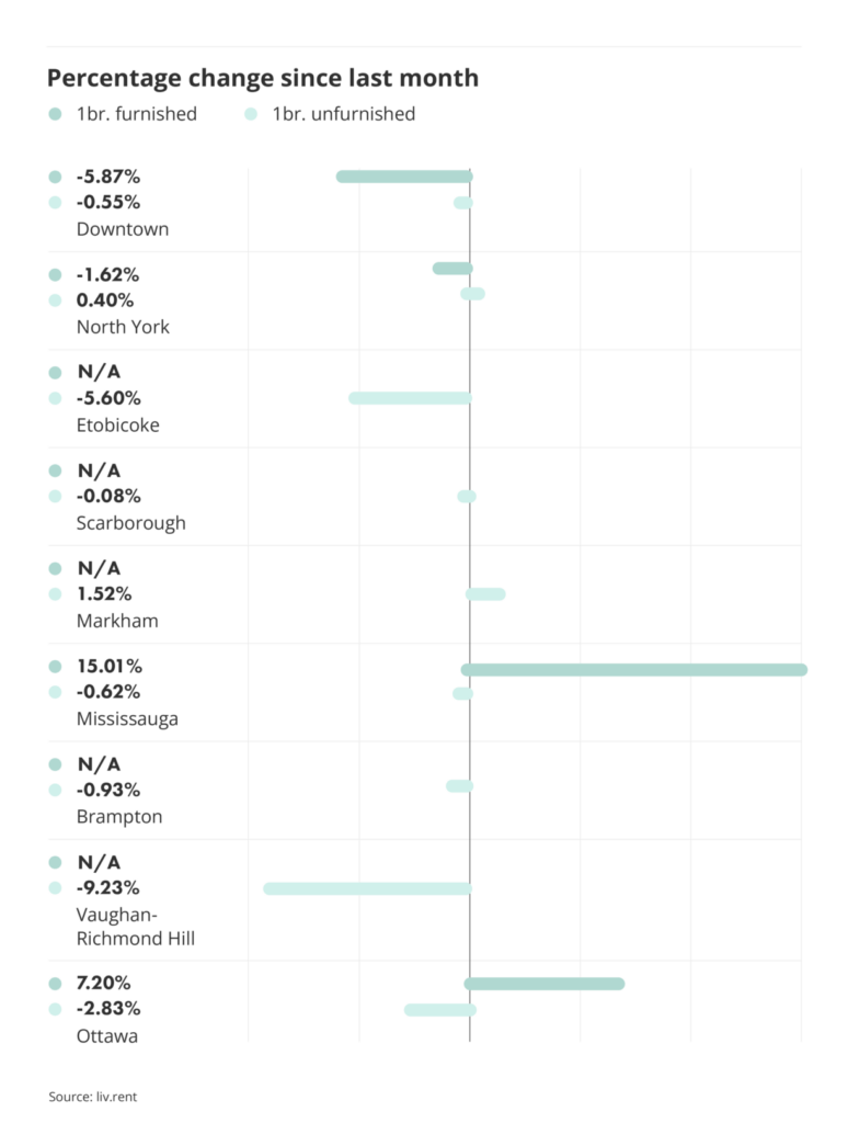 Rates for unfurnished one-bedroom units in the GTA varied this month. Markham increased slightly (1.52%), while Vaughan-Richmond Hill saw a significant decrease (-9.23%).