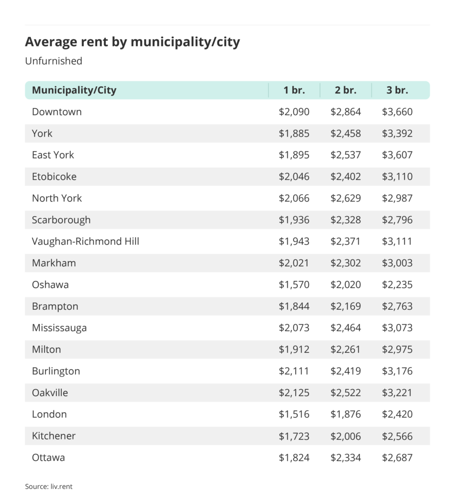 With Ontario’s different communities being so diverse, we’re breaking down the GTA into its different cities and municipalities to see the price difference within listing types: one-bedroom, two-bedroom, and three-bedroom units, both unfurnished and furnished.