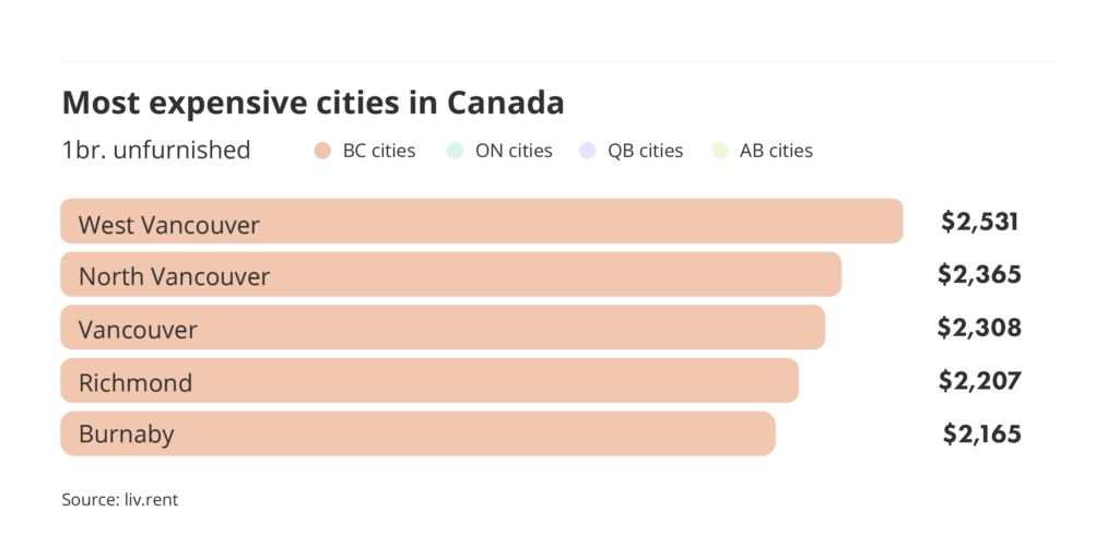 This December, five of the country’s most expensive cities are located in Metro Vancouver. West Vancouver is the most expensive city in the country to rent in, followed by North Vancouver, Vancouver, Richmond, and Burnaby.