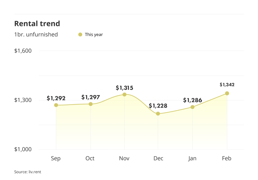 This February, average monthly rent prices for unfurnished one-bedroom units increased (4.29%) to $1,342/month.