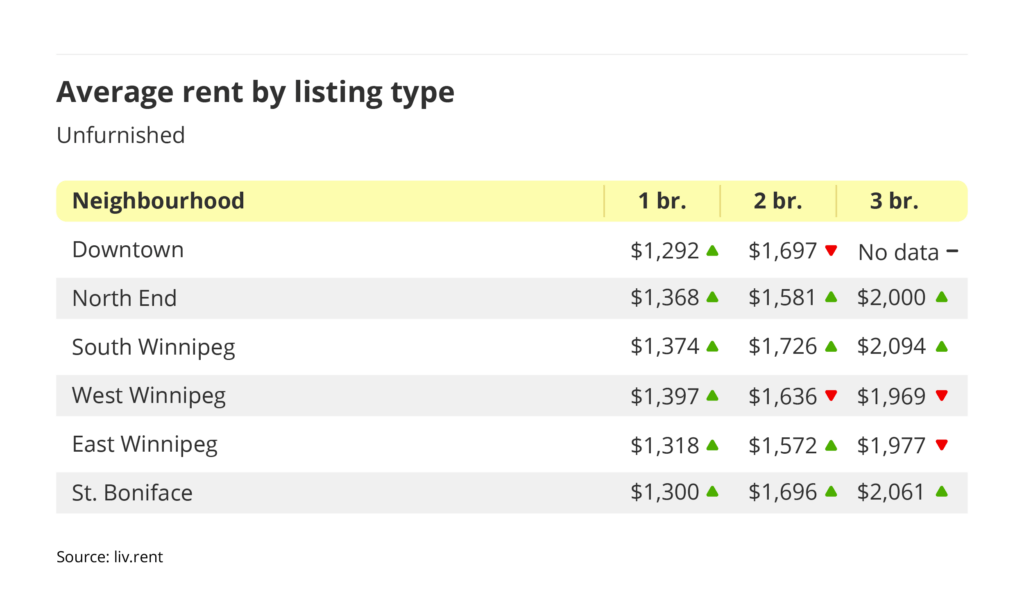 • All unfurnished one-bedroom rent prices increased across Winnipeg neighbourhoods.