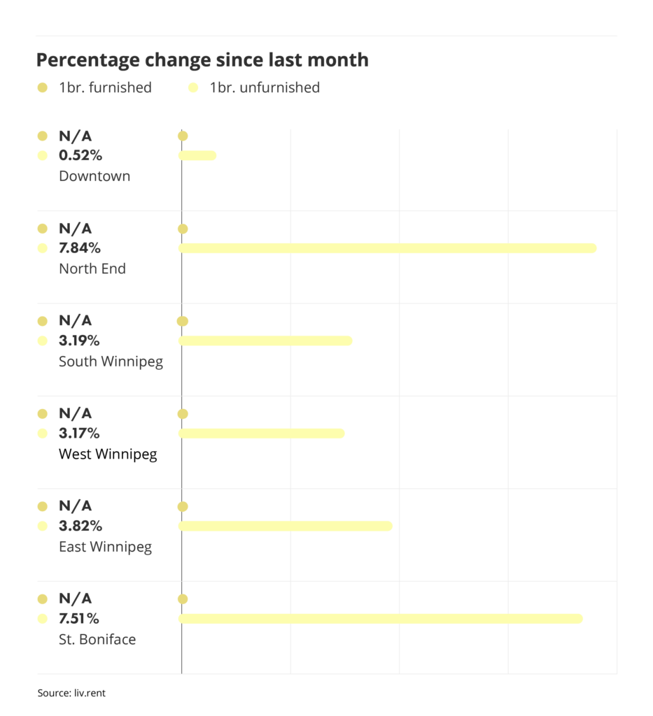 To better understand how rent prices have changed in Winnipeg, let’s look at the most significant changes for unfurnished one-bedroom units this month.
