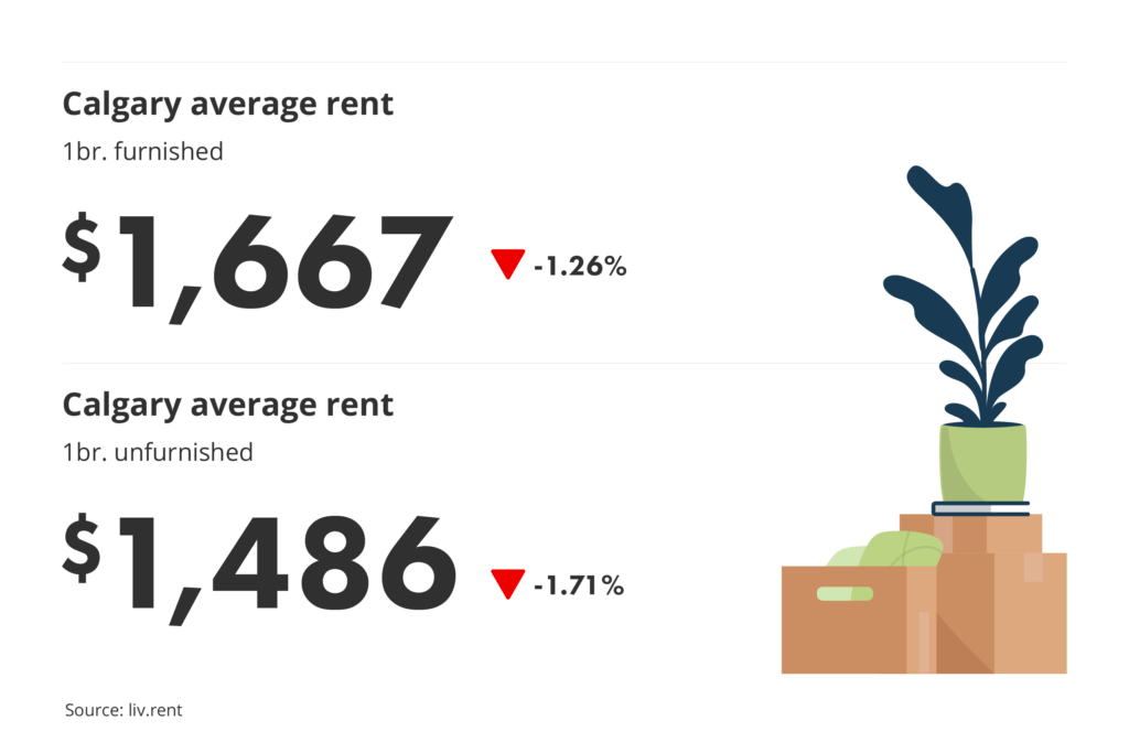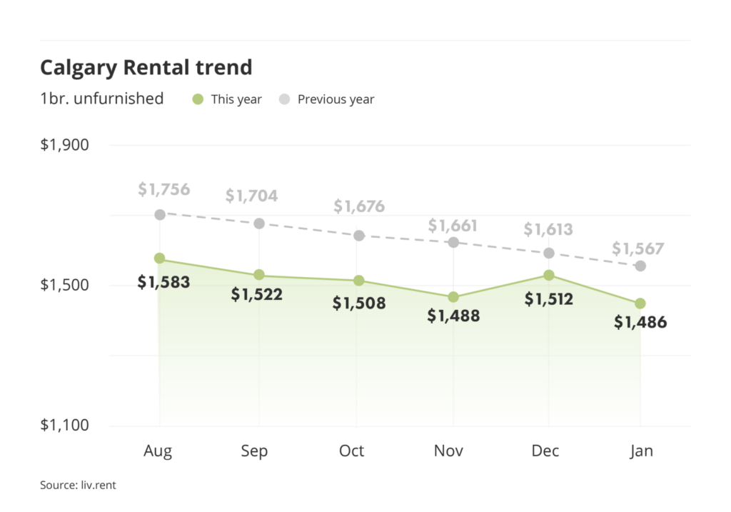 This January, Calgary’s city-wide average monthly rent price for an unfurnished one-bedroom unit decreased by $26, bringing the rate for an unfurnished one-bedroom unit to $1,486/month.
