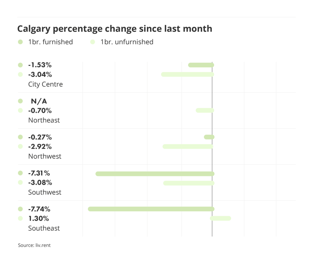 - Prices decreased for all unfurnished one-bedroom units in all quadrants across Calgary except in Southeast.