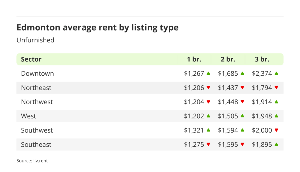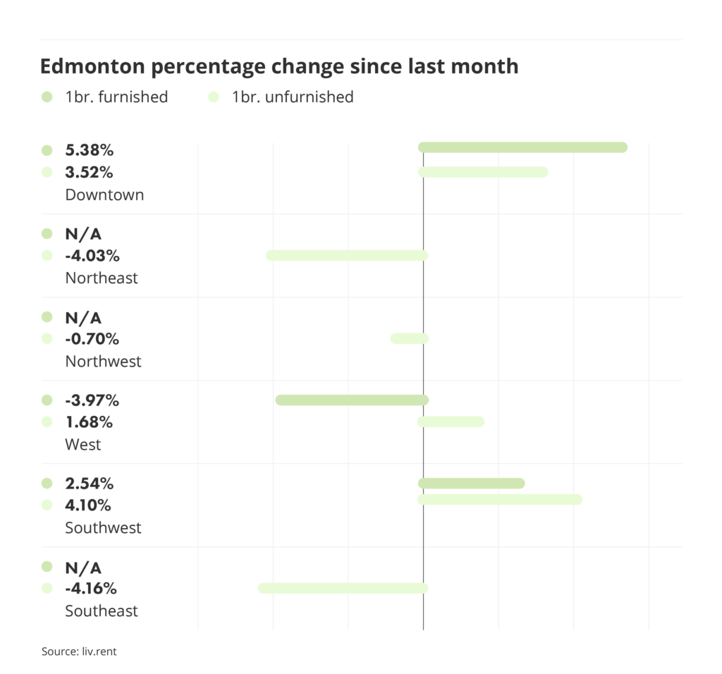 - Rents decreased for all unfurnished one-, and two-bedrooms across Edmonton except Downtown, Southwest and West Edmonton.