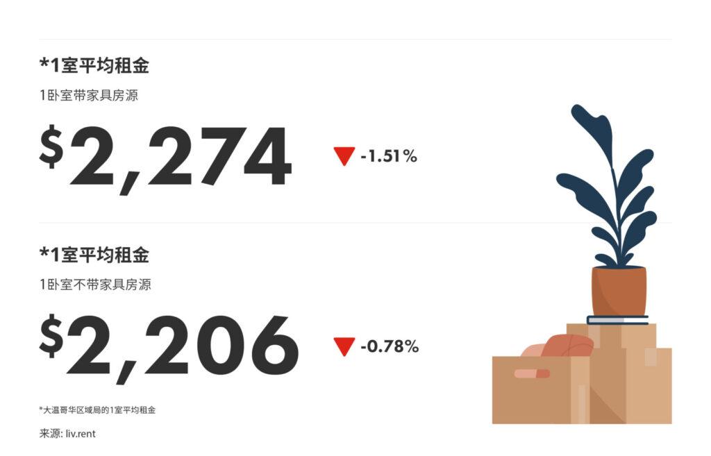 其中温哥华市带家具的出租房源,一卧室平均租金$2,718/月(环比下跌$45);两卧室出租单位平均租金$3,266/月(环比下跌$53月)。
